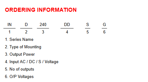 1. Series Name 2. Type of Mounting 3. Output Power 4. Input Type 5. Number of Outputs 6. Output Voltage |